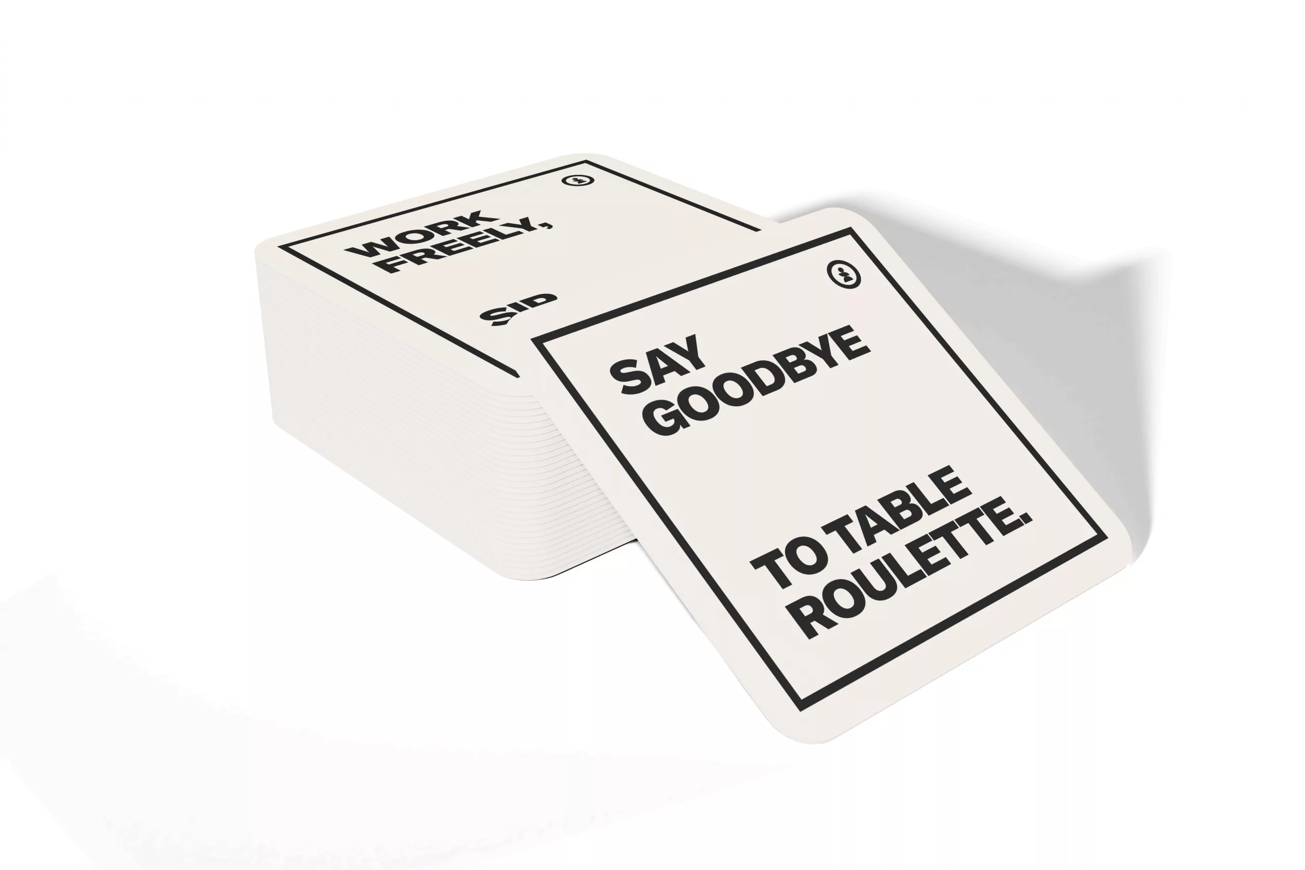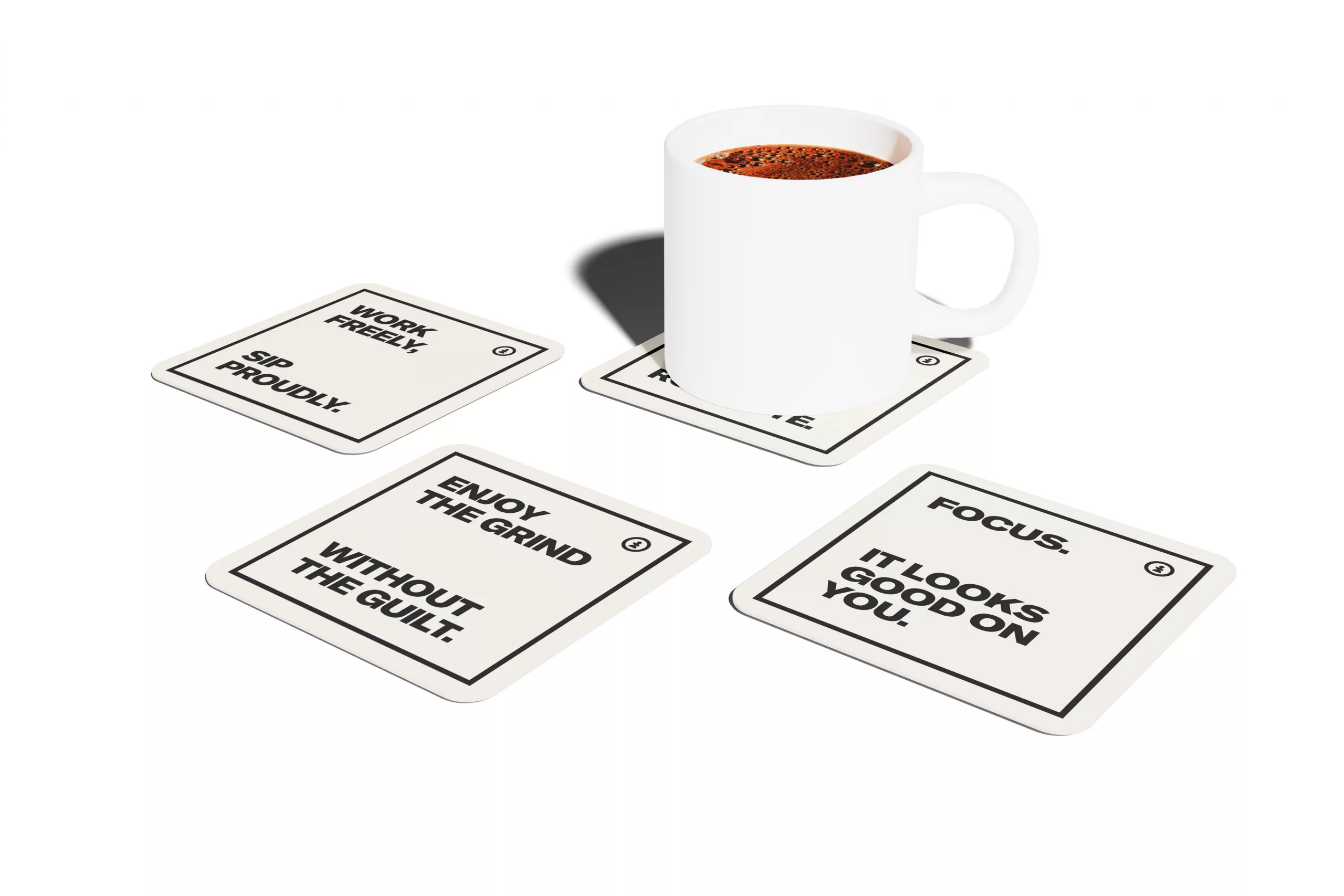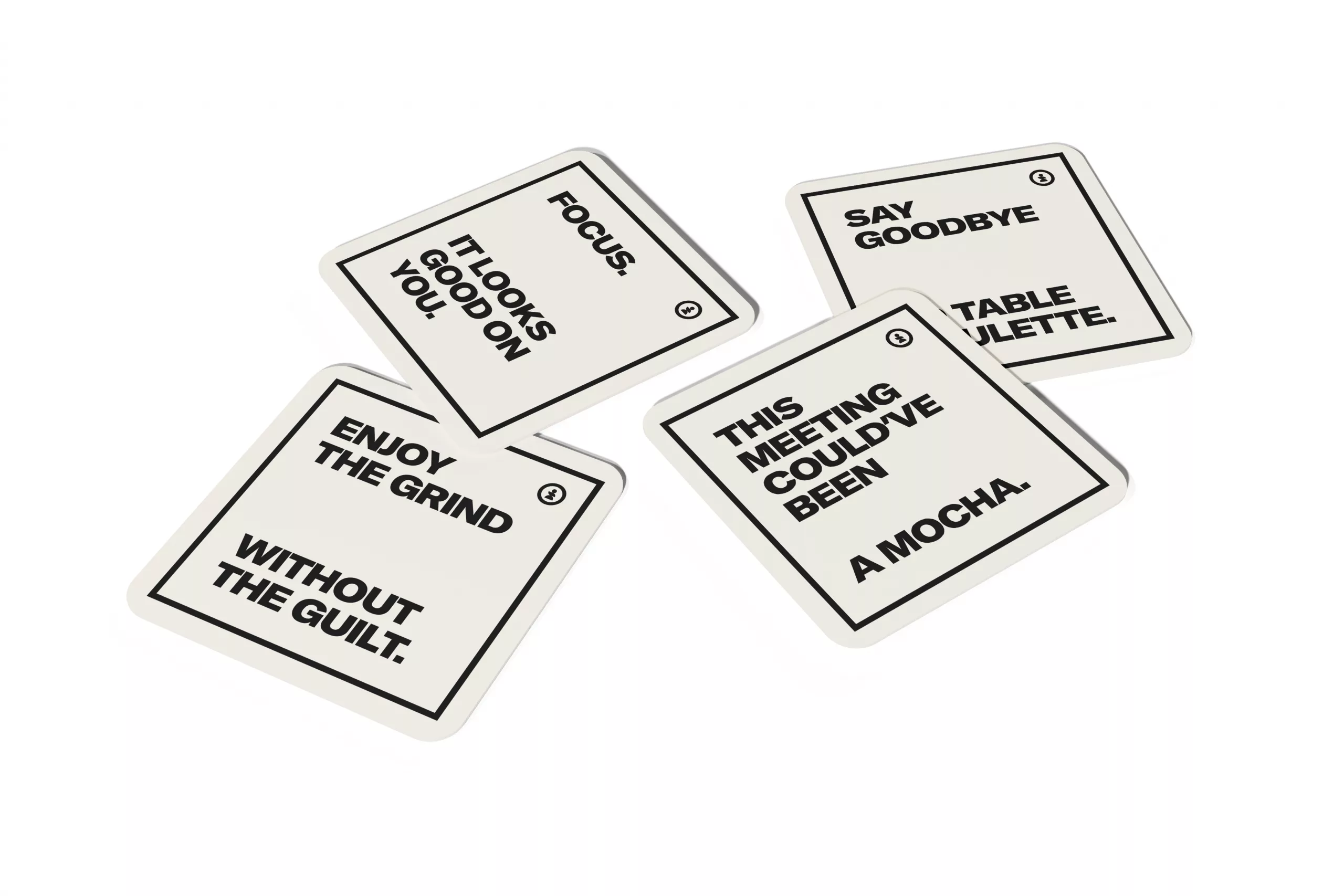 Selection of cream colour coasters with a variety of slogans.