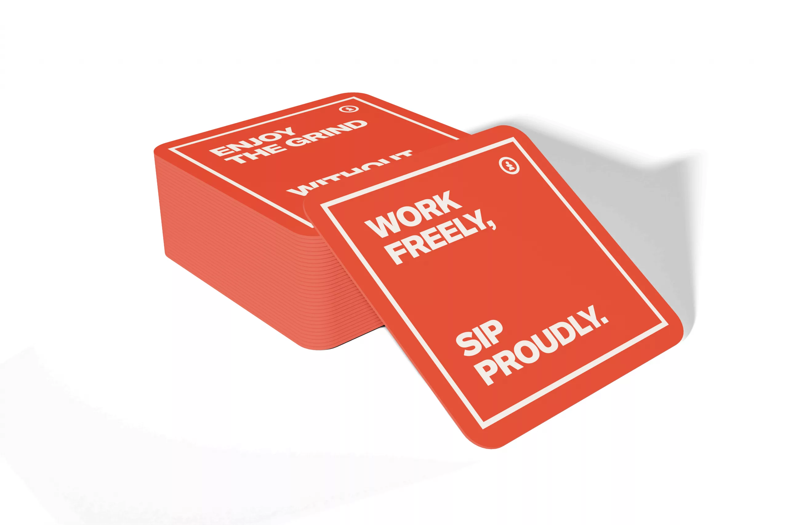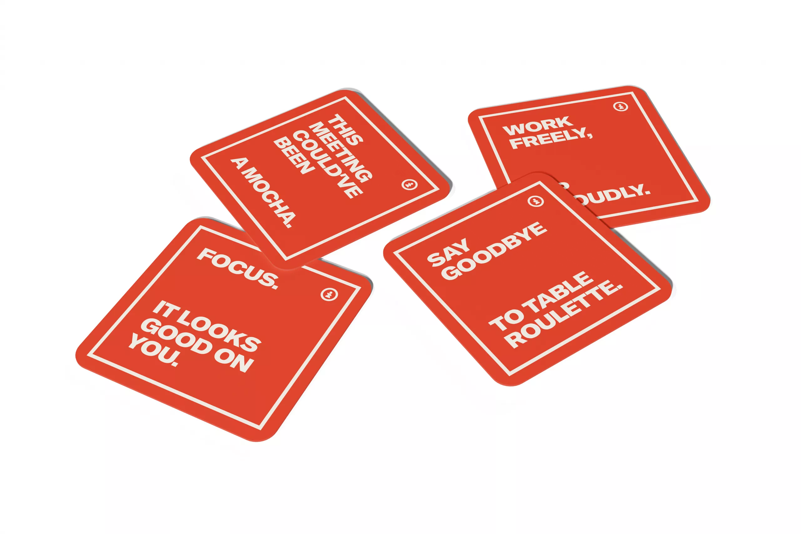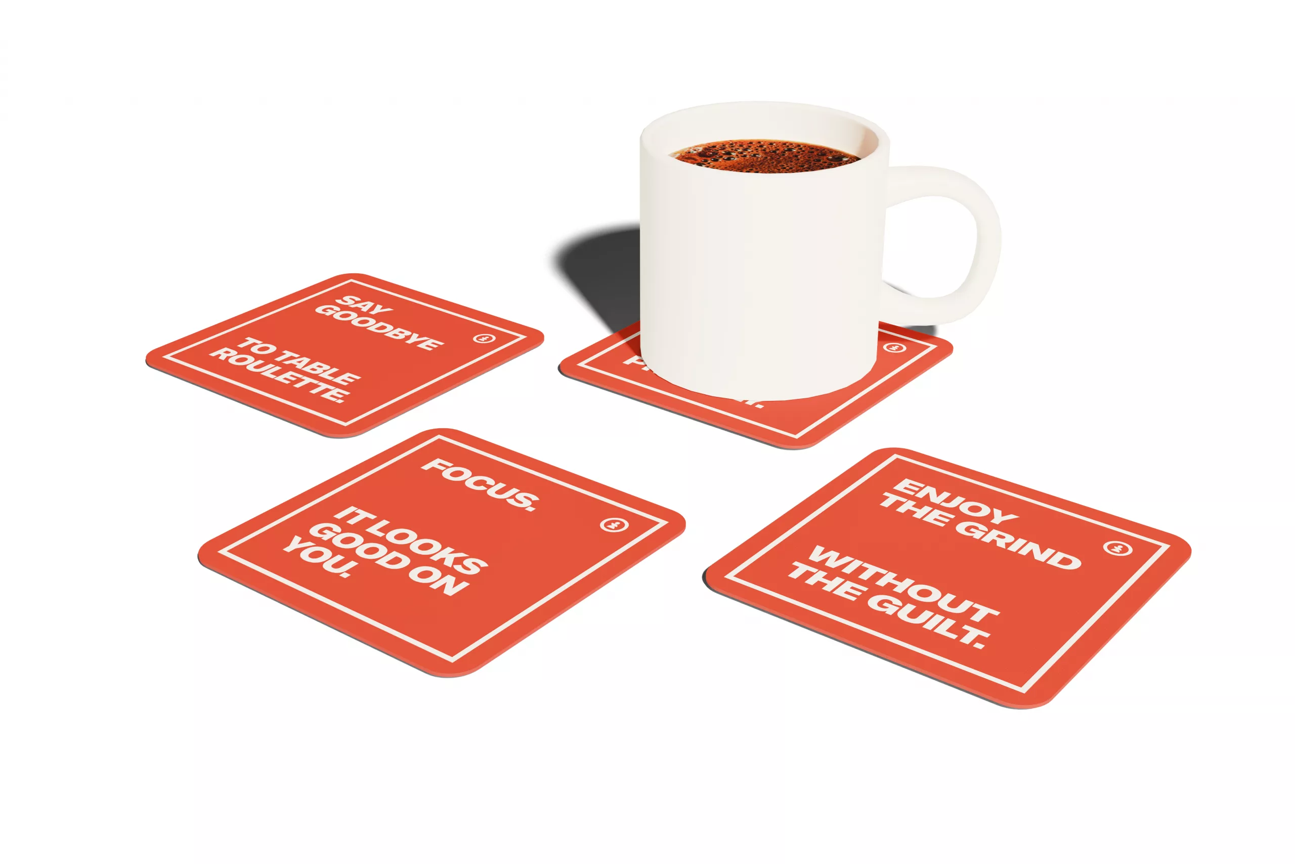 Selection of orange colour coasters with a variety of slogans.